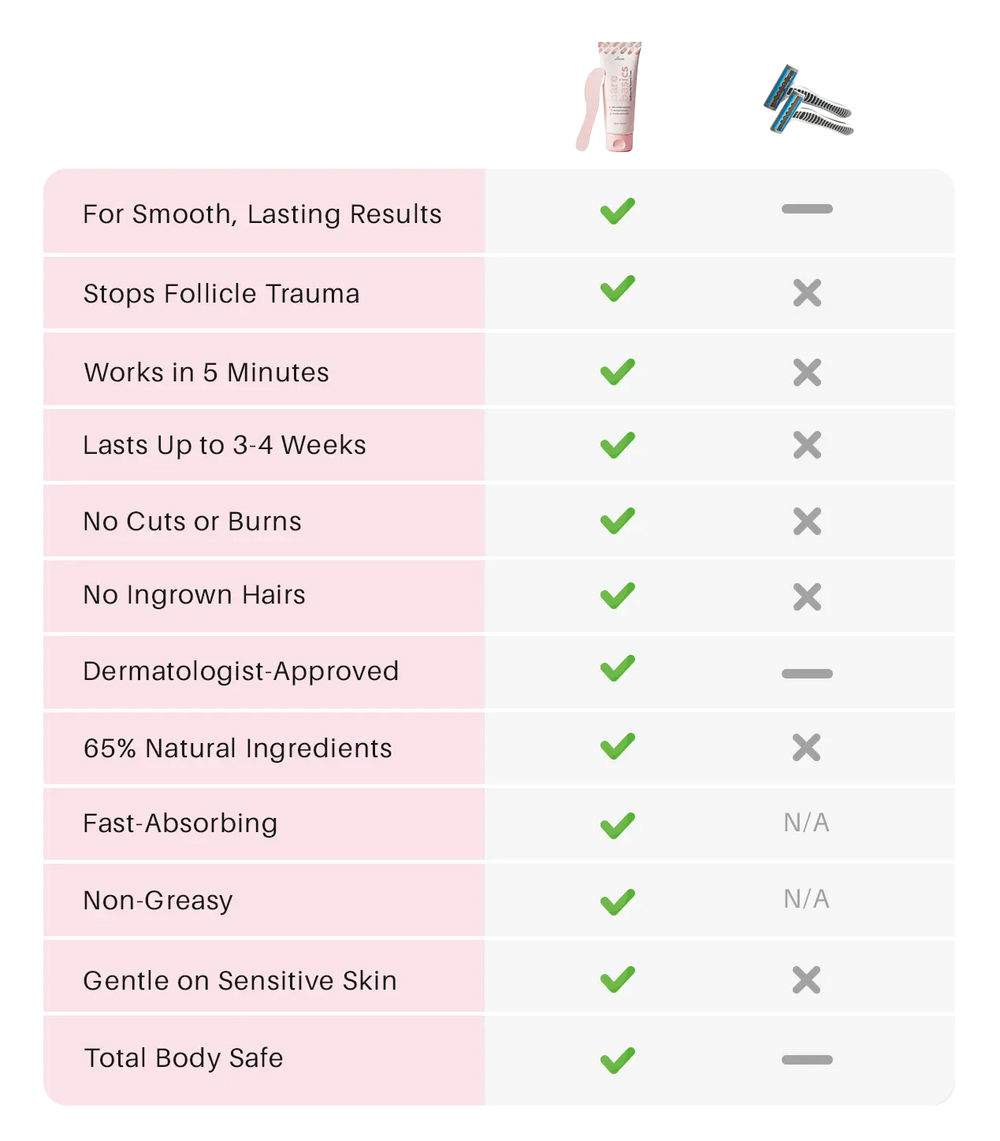 Bare Basics dissolves hair at the protein level—no blades, no cutting, no follicle trauma. Without those trauma signals, the defensive acceleration pattern stops. Your skin gets a break, and so do your follicles.