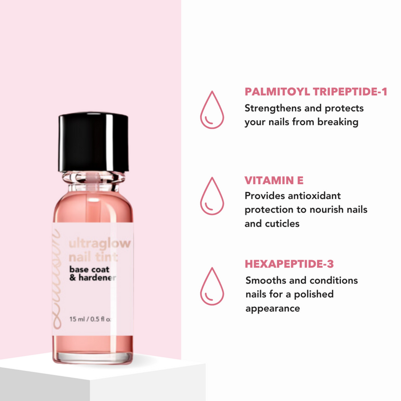 UltraGlow Nail Tint Base Coat + Hardener: Provides a dual-action solution by enhancing nail strength and applying a beautiful, natural tint, preventing chips and splits while maintaining a polished look.